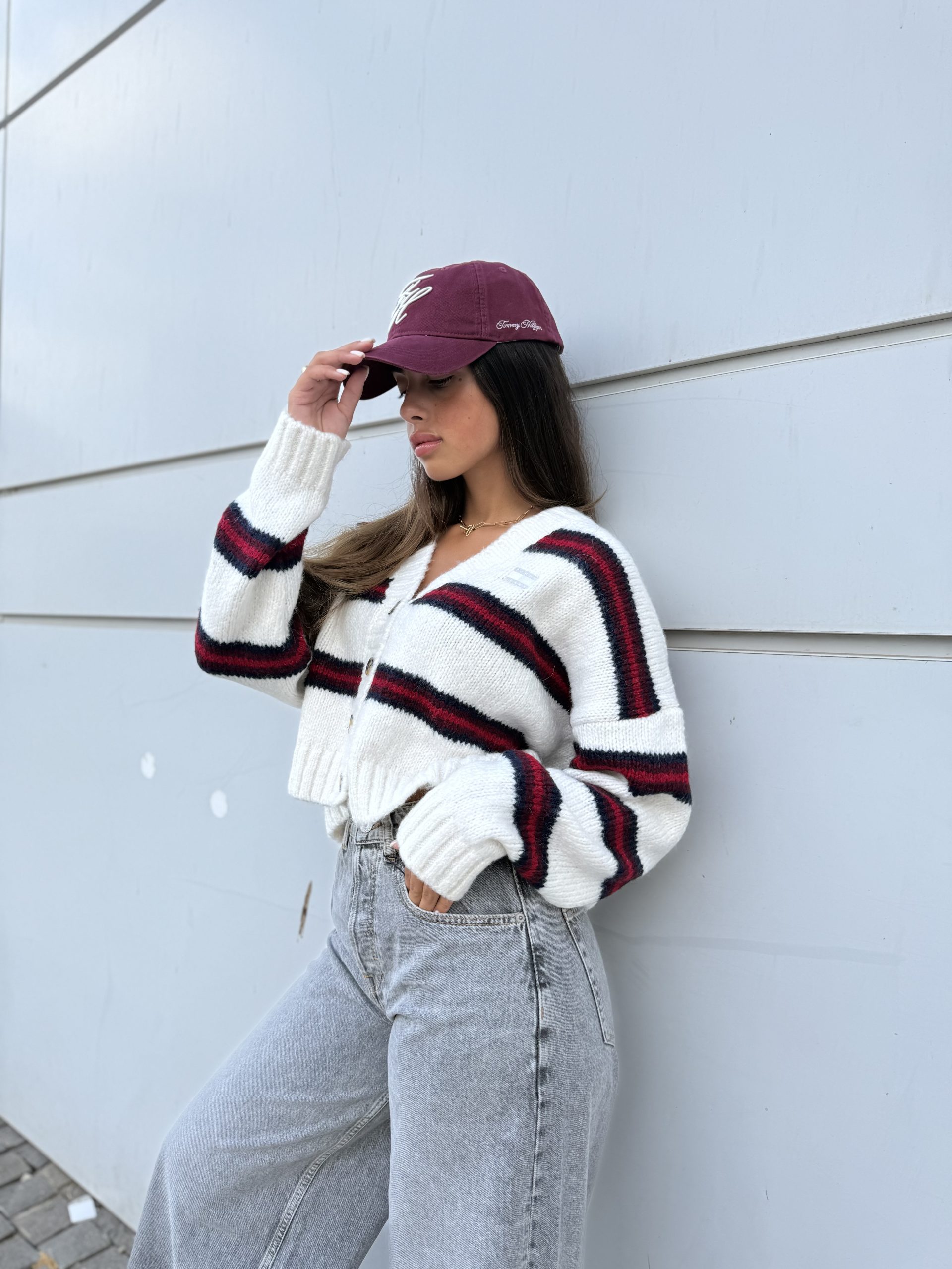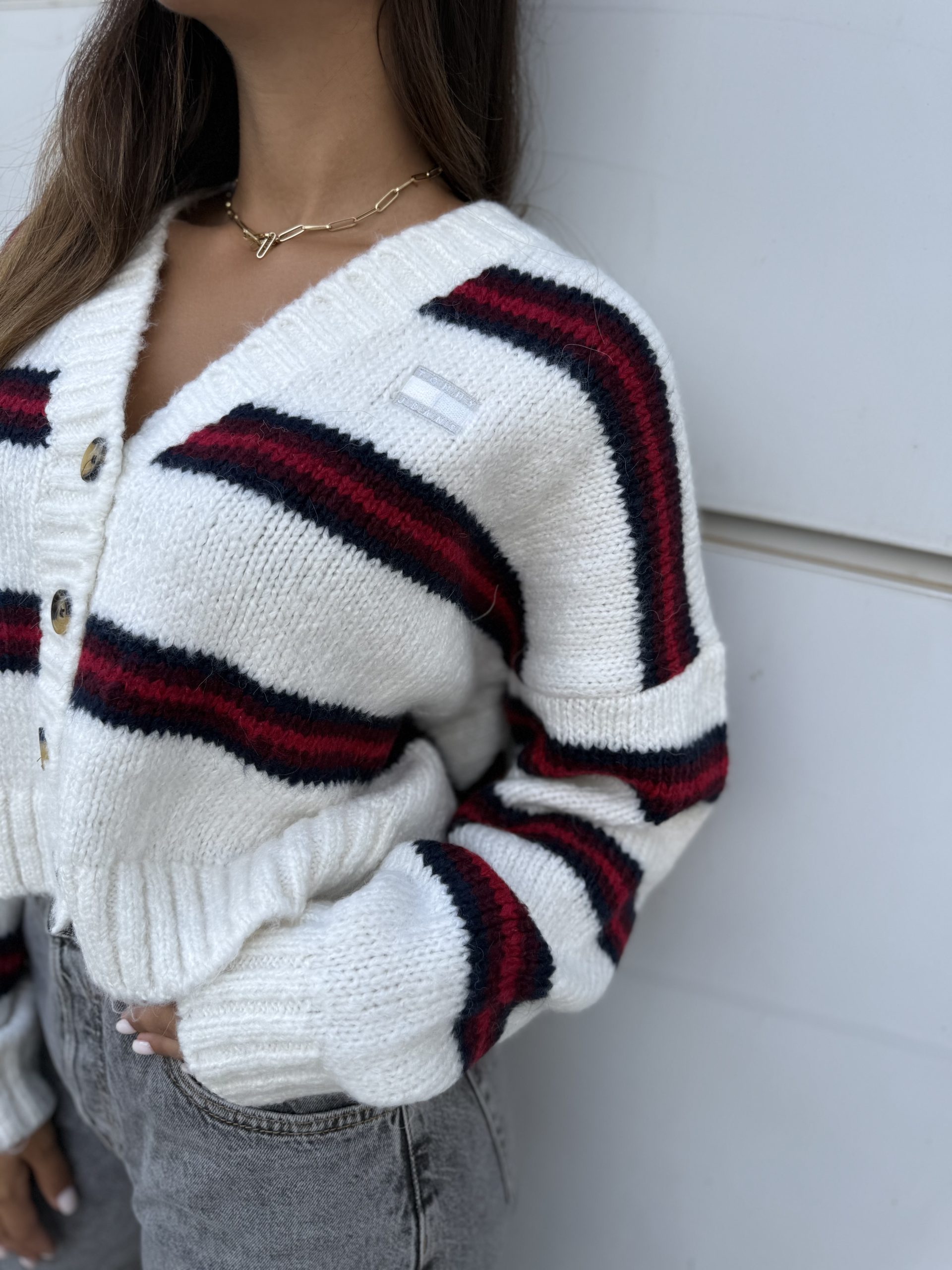 הדוגמנית לובשת סוודר עליונית כפתורים פסים