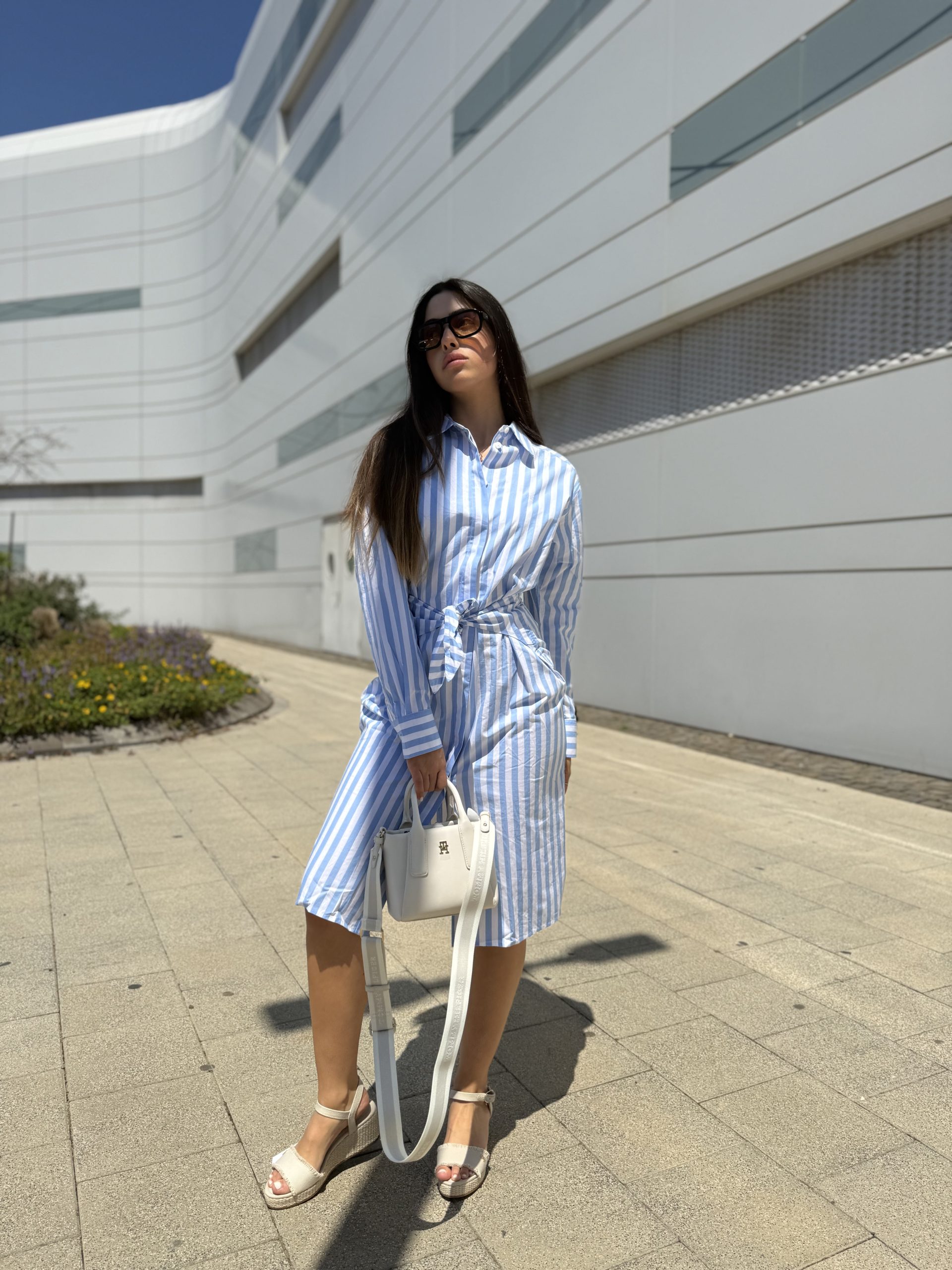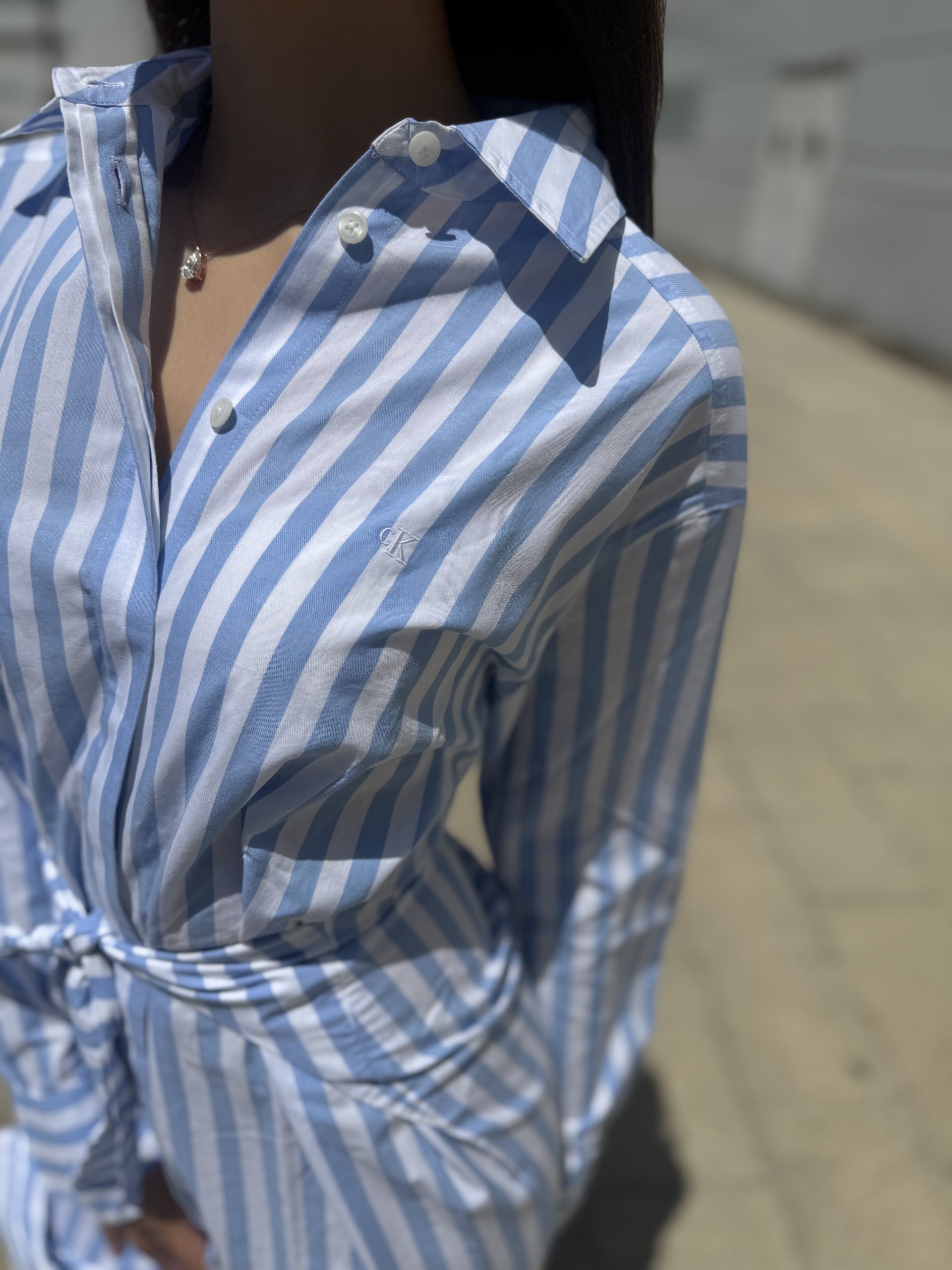 שמלה CK פסים לבן ותכלת עם קשירה במותן